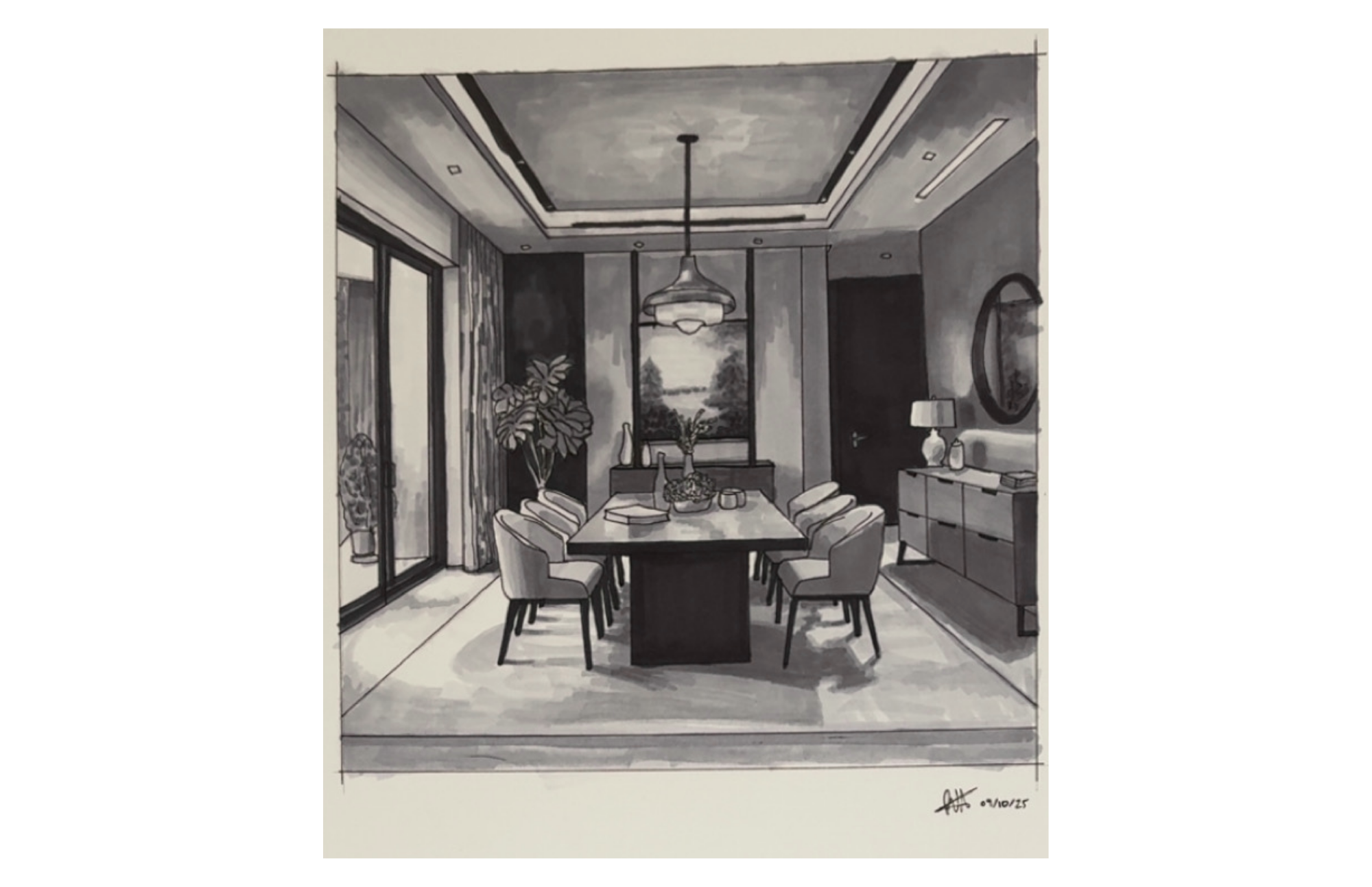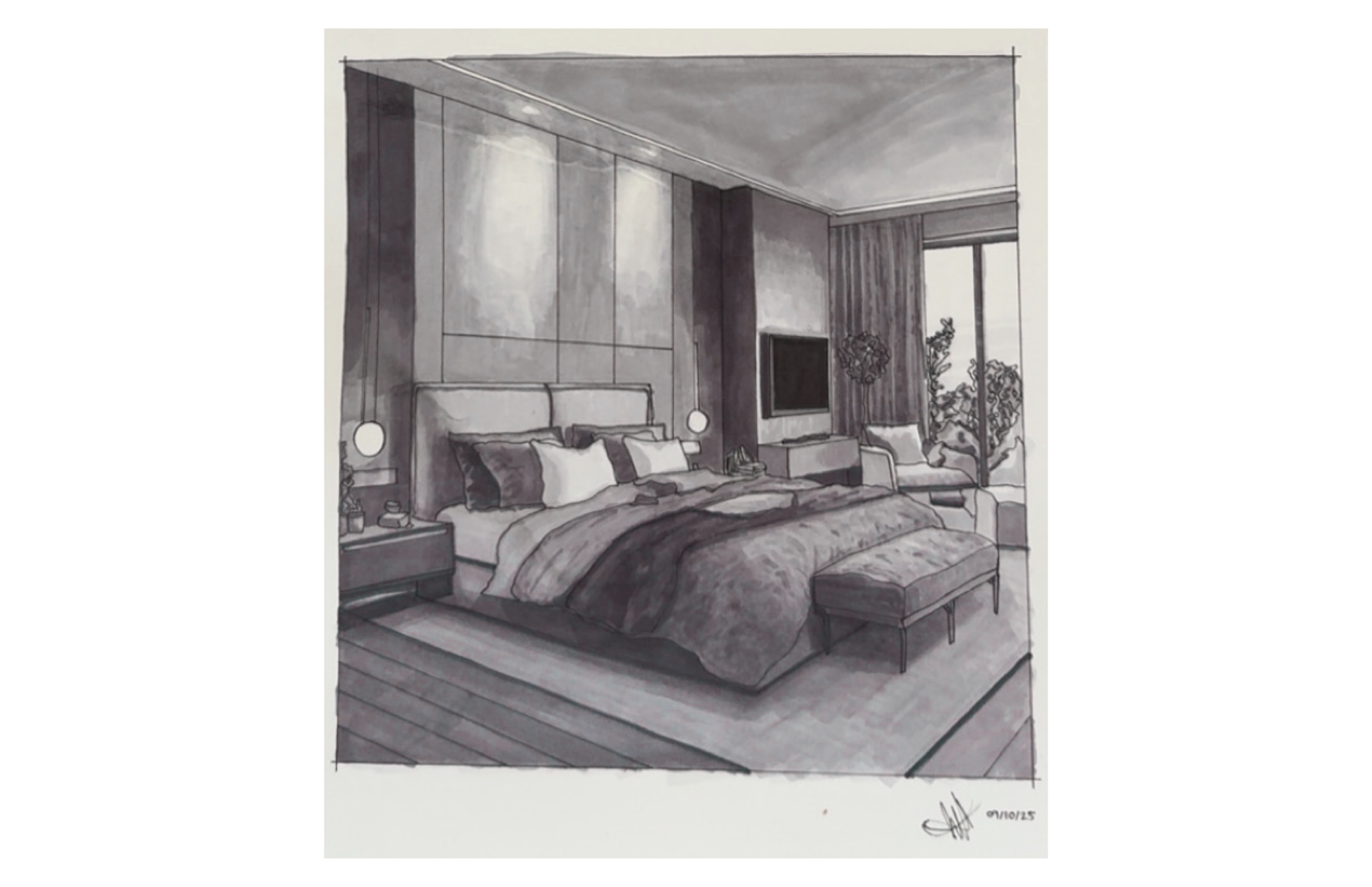 Hand curated with grey-scale markers and lots of time paying attention to every detail and shade. These perspective drawing are meant for the client to experience the room before it even exists.