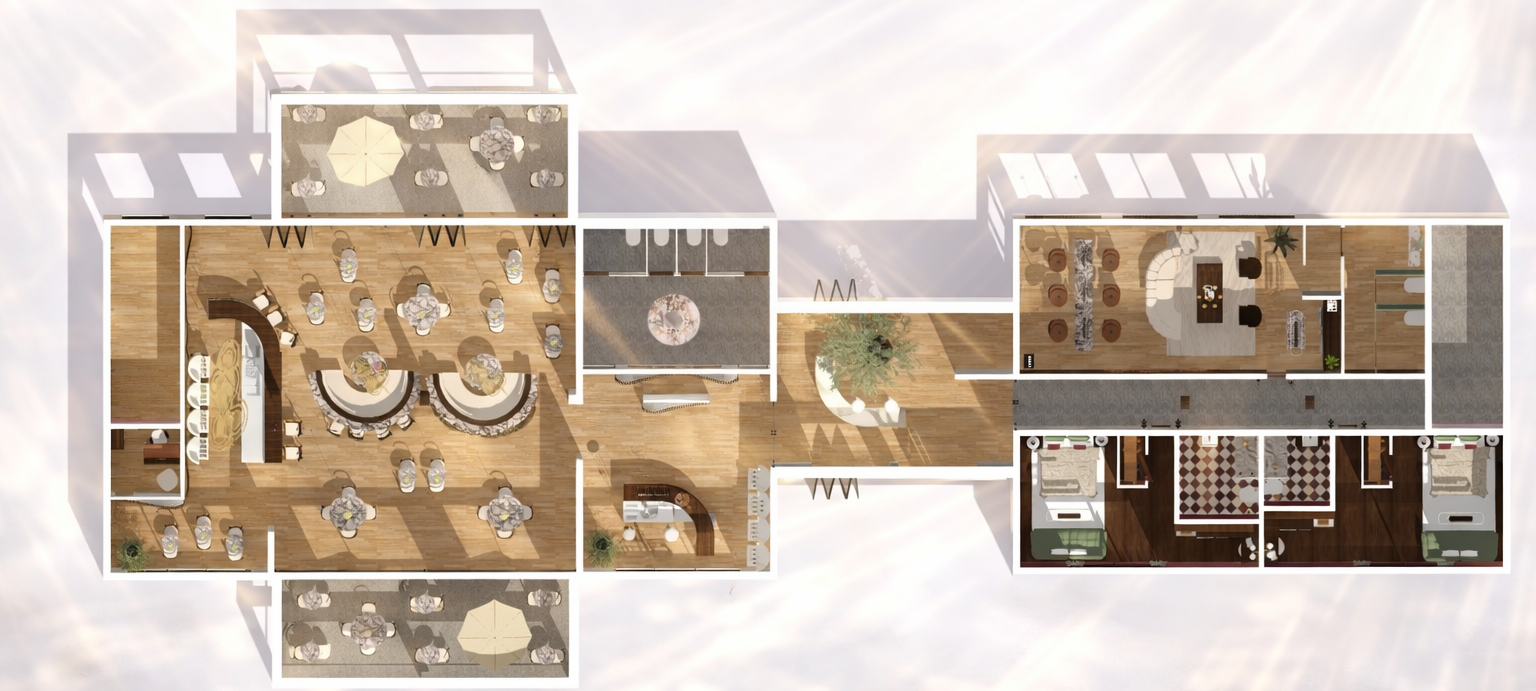 Floor plan created in Sketch-Up. This is a floor plan rendering of a winery and spa. Incorporated with an organic feel and material details.